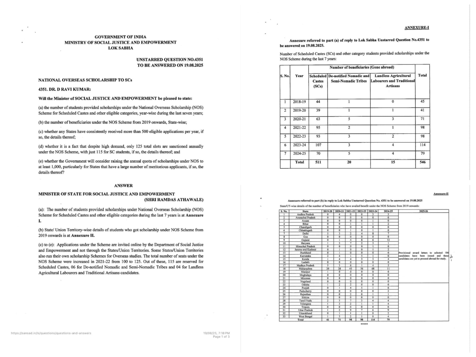 ரவிக்குமார் எம்.பி எழுப்பிய கேள்விக்கு அமைச்சர் அளித்த பதிலில் தெரியவந்த உண்மை ===“ அ) பட்டியல் சாதியினர் மற்றும் பிற தகுதியுள்ள பிரிவுகளுக்கான தேசிய ஓவர்சீஸ் ஸ்காலர்ஷிப் (NOS) திட்டத்தின் கீழ் ஒன்றிய அரசால் உதவித்தொகை வழங்கப்பட்ட மாணவர்களின் எண்ணிக்கைகடந்த ஏழு ஆண்டுகளில் எவ்வளவு , ஆண்டுவாரியாகத் தெரிவிக்கவும்;(ஆ) 2019 ஆம் ஆண்டு முதல் ஒன்றிய அரசின் இந்தத் திட்டத்தால் பயனடைந்த மாணவர்களின் எண்...
