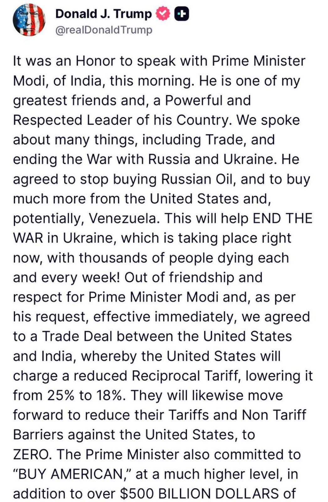 மிகப்பெரிய அவமானம்! டிரம்ப்புடன் பேசியது என்ன என்பதை பிரதமர் மோடி நாடாளுமன்றத்தில் தெரிவிக்க வேண்டும் ! ==டிரம்ப் சொல்லியிருப்பது உண்மையென்றால் இந்தியாவின் இறையாண்மையையே மோடி அரசு விட்டுக்கொடுத்துவிட்டது என்றுதான் பொருள். இதற்கு நாடாளுமன்றத்தில் பிரதமர் விளக்கமளிக்க வேண்டும். “அமெரிக்கா விதித்த வரியில் 7% குறைக்கும், ஆனால் இந்தியாவோ அமெரிக்காவிலிருந்து தான் இறக்குமதி செய்யும் பொருட...