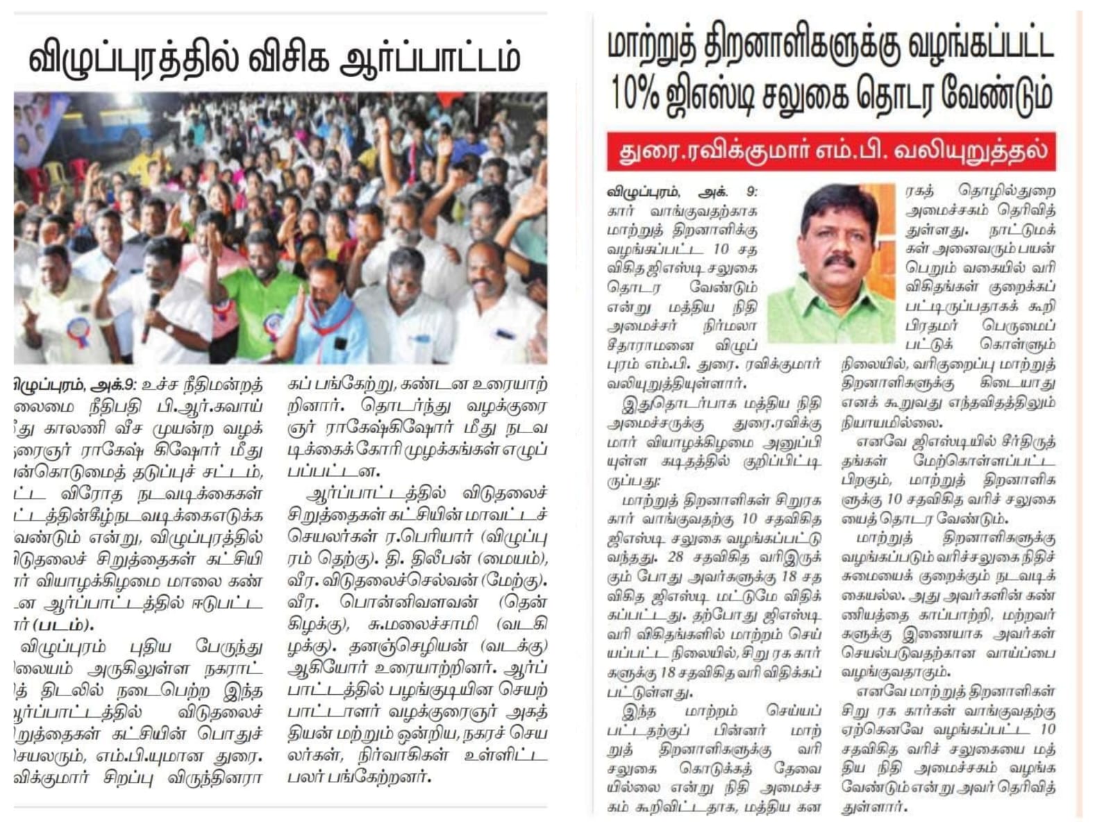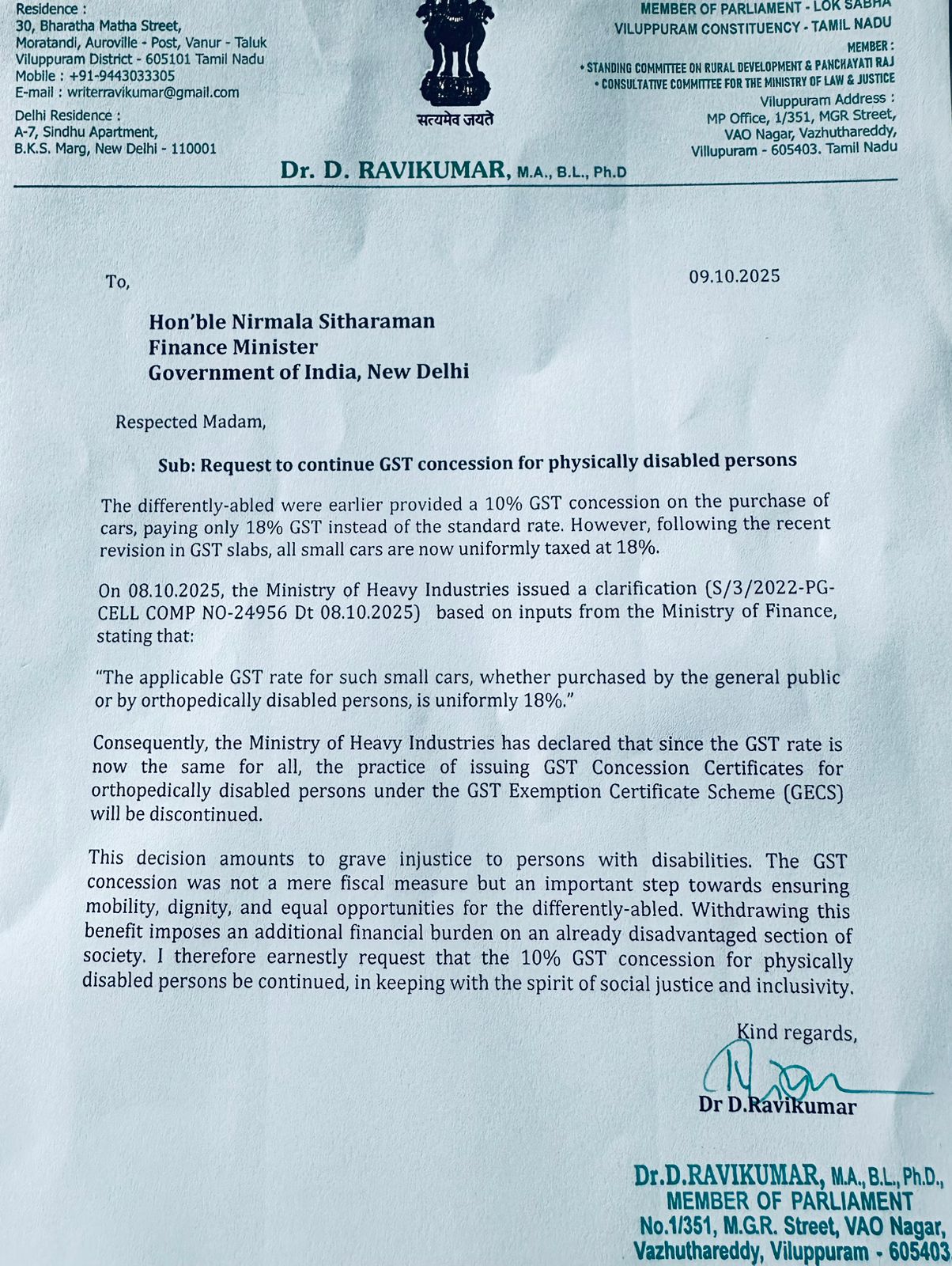 நிதி அமைச்சர் மாண்புமிகு நிர்மலா சீதாராமன் அவர்களுக்குக் கடிதம் எழுதியுள்ளேன்மாற்றுத் திறனாளிகள் சிறு ரக கார் வாங்குவதற்கு 10% ஜிஎஸ்டி வரி சலுகை வழங்கப்பட்டு வந்தது. 28% ஜிஎஸ்டி வரி இருந்தபோது அவர்களுக்கு 18% விதிக்கப்பட்டது. தற்போது ஜிஎஸ்டி வரிகளில் மாற்றம் செய்யப்பட்டு சிறு ரக கார்களுக்கு 18% வரி விதிக்கப்பட்டுள்ளது. இந்த மாற்றம் செய்யப்பட்டதற்குப் பின்பு மாற்று திறனாளிகளுக்கு வரி சலுகை கொடுக்க...